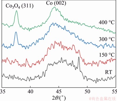 A low Co content in Co-TiO2 nanocomposite films should be maintained to obtain the desirable magnetoresistive characteristics [18]. A low Co content leads to a small particle size, which causes Co to oxidize easily. ZHU et al [19] claimed that the particle size can be controlled by adjusting substrate temperatures with the same composition.