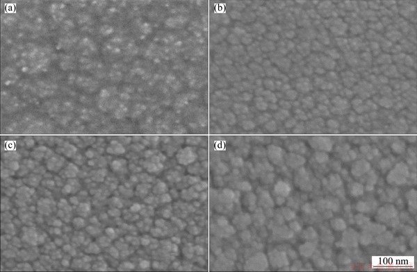 Figure 3 shows SEM images of the films deposited at various Ts. The cluster size present in the films can be observed clearly. In particular, the cluster size on the film surface increases gradually as Ts increases possibly because of the thermal effects on grain size [20].