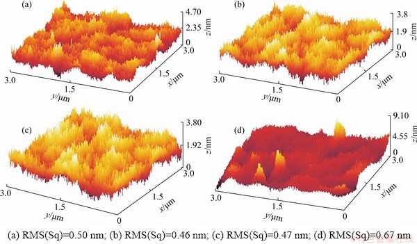 Figure 4 shows the AFM images of Co-TiO2 films deposited at RT, 150, 300 and 400 °C and their surface morphologies. The root mean square roughness (RMS(Sq)) does not change significantly below 150 °C, but it increases from 0.50 to 0.67 nm at Ts from 150 to 400 °C. At high temperatures, the surface roughness of the films increases with increasing Ts because of the growth of the particles. This finding is consistent with those shown in the SEM images.