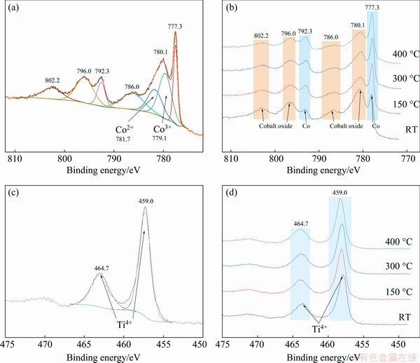 Fig. 5 High-resolution XPS spectrum of Co 2p region from surface of film deposited at RT (a), XPS spectra in Co 2p region of films deposited at various Ts (b), high-resolution XPS spectrum of in Ti 2p region from surface of film deposited at RT (c) and XPS spectra in Ti 2p region of films deposited at various Ts (d)