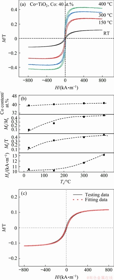Fig. 6 Magnetic hysteresis loops of Co-TiO2 nano- composite films deposited at various Ts (a), plots of Co content, remanence ratio, saturation magnetization and coercivity as function of Ts (b), and representative fit of Langevin equation to magnetization curve of sample prepared at RT (c)