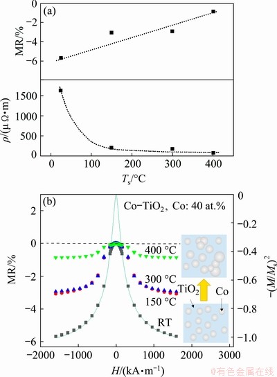 Fig. 7 Dependence of magnetoresistance ratio (MR) and resistivity of Co-TiO2 nanocomposite films on Ts (a) and dependence of MR and -(M/Ms)2 on external magnetic field H at various Ts (Solid curve shows normalized magnetization required to fit magnetoresistance response of sample prepared at RT, and inset presents the proposed structural model of Co-TiO2 nanocomposite films) (b)