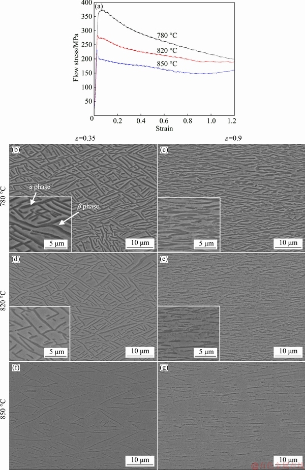 Fig. 2 Flow stress-strain curves of samples deformed at 780, 820, 850 °C and strain rate of 1 s-1 (a), and SEM micrographs of deformed TC17 alloy at strains of 0.35 (b, d, f) and 0.9 (c, e, g)