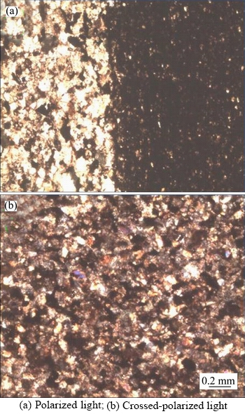 Thin section was made by grinding down a slice of red shale and its microstructure was analyzed using the petrographic microscope.Figure 4 shows the microstructure of red shale using the polarized and crossed-polarized light. It shows that the red shale has slit, clay structure and bedding features. Contents of debris and interstitial material are 45% and 55%, respectively. The main gradients of debris include sericite, quartz, muscovite, feldspar and traces of zircon, while the interstitial material includes the sericite, quartz, calcite, clay and iron minerals, belonging to the cemented rock type. The main mineral constituents of red shale are summarized in Table 1.