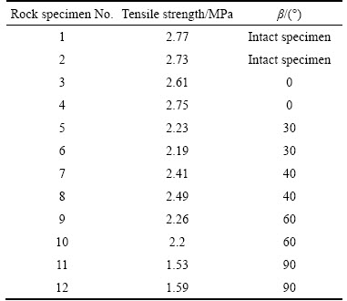 The tensile strengthes of diametric red shale specimens were measured by conducting the Brazilian tests with Instron 1342 Servo Electric Test System. Two kinds of tests were carried out: one is conducted with intact red shale and the other with red shale containing a single bedding plane so that the influence of weakness plane can be vividly captured. Table 3 shows that the tensile strength of red shale is significantly influenced by the weakness plane.