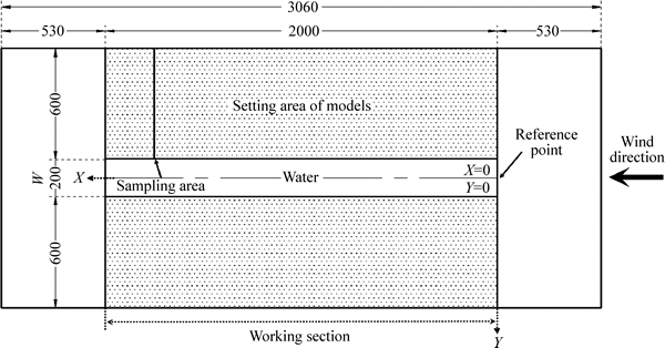 The wind direction, water body and relative position of the buildings are shown in Fig. 2. The sampling points, as given in Fig. 1, was 0.01 m high (measured from the ground) and 1.75 m from the reference point. The reference point shown in Fig. 1 was at the left edge of the water channel. The mean velocity profile within the neutral ABL (atmospheric boundary layer) was given by the exponential distribution: