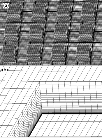 According to the setup in the wind tunnel experiment, the computational domain size was set as 3200 mm×2000 mm×305 mm, i.e. 106Hb, 66Hb and 10Hb (Hb is the height of the cube), which reproduces the actual wind tunnel condition. The length and width of the block area were approximately 1970 mm and 390 mm, respectively. The distance from the first row to the embankment was set at 10 mm.
