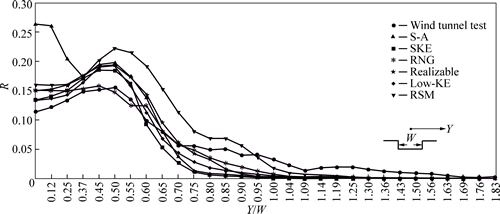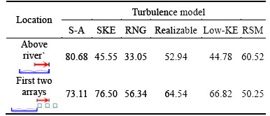 Table 1 shows the AREVP of the different turbulence models. It is apparent that the VP values are smaller than 0.03 when Y/W is higher than 1.0 (Fig. 5), i.e. boundary of the second array. Considering that the values might be affected by the instrument precision, the VP values are not analyzed as a main concern when Y/W is higher than 1.0 in this work. It can be seen that the error of RNG model is apparently lower than that of other models in the area above river, which demonstrates that RNG model is effective for this kind of airflow. For the areas at first two arrays and behind first two arrays, RSM model performs better than other models. That is possibly because RSM model has been considered to be accurate when analyzing flow with strong anisotropic behaviors around building blocks with increasing complexity. However, RSM model seems to fail in predicting the airflow above river. That is because many more assumptions and modeling of various terms in the Reynolds stress transport equation weaken the simulation accuracy instead. Some studies found that the RSM model was not improved in many results in predicting a simple airflow such as natural convection [43]. Based on simulation results, the Low-KE model is expected to have a relatively better performance than the SKE model, especially for handling near-wall flows, which is in accordance to turbulence theory [44]. The simulation results of RNG model have the best overall performance in the whole areas in terms of accuracy, numerical stability, and computing time attributed to improved effective viscosity prediction and better treatment of near wall turbulence effects, while RSM model also has the competitive performance.