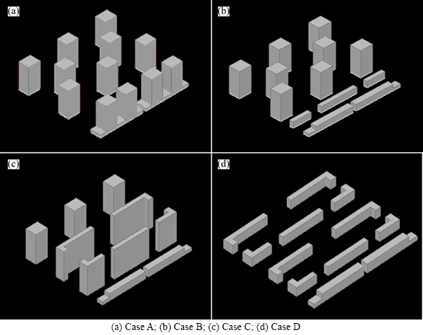 In this work, the RNG model was used to predict the moisture distributions because the results from this model showed a relatively good agreement with the wind tunnel results mentioned above. Various building distributions in urban waterfronts can be found in China, as shown in Fig. 6. In this work, four types of waterfront plans were considered (as shown in Fig. 7). These waterfront plans can be considered to represent the actual distributions of building complexes in the northern cities of China. The characteristic climate in northern China is hot in the summer and very cold in the winter, therefore, the orientation of the buildings is mostly toward south to gain more sunshine. Additionally, a number of factors were considered, such as layouts of building complexes, including different building shapes, heights, and number of rows. Case A is a column type that represents the high-rise commercial or residential buildings that are mainly built along the water body. Case B is a board-style construction of multi-storey buildings and is a column type. This type indicates that this waterfront area is mainly mixed with residential and small-scale business buildings. A local enclosed type was adopted in Case C and Case D with different building floor area ratios. It should be noted that the local enclosed type is very popular in northern China because this type can be considered to block more cold airflow into the internal area in winter. The detailed information about each case is summarized in Table 2.