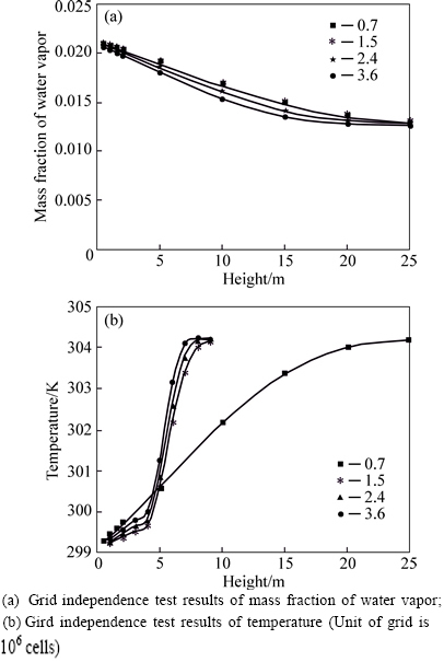 To guarantee good accuracy and convergence stability, six turbulence models, the S-A, SKE, RNG, Realizable, Low-KE, and RSM models, were discussed with changing the mesh of the structured grid to realize high possible grid resolution according to the computer ability. Low-KE model has higher sensitivity in the range near the wall surface compared with other 2-eq models in the study. Thus, Low-KE model was employed to test the grid independence in the study. Four cases with different grids were investigated, i.e. 1.8×106 cells, 2.6×106 cells, 3.3×106 cells and 4×106 cells. The results indicated that for Low-KE model, the difference of mass fraction of water vapor between the case with 4×106 cells and the case with 3.3×106 cells is very small. Thus, 3.3×106 cells were employed in the numerical simulation in the study.