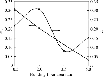 Figure 13 shows the effect of building floor area ratio on water vapor mass fraction and temperature. The mv and tv were calculated by the surface average value of the whole building area. The building floor area ratio showed an obvious linear effect on mass fraction ratio of the water vapor. The mv decreased by 27.6% when the building floor area ratio increased from 0.5 to 5.0. This attributes to lower wind velocity caused by the higher building floor area ratio. On the other hand, the effect of building floor area ratio on temperature was much more complicated. The tv showed an uptrend when the building floor area ratio increased from 0.5 to 2.0 and from 3.5 to 5.0, then went down when building floor area ratio increased from 2.0 to 3.5. The reason for this trend is that the higher building floor area ratio affects not only the wind environment but also the sunshade. The results indicated an integrated effect on the thermal environment.