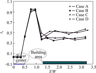 Figure 14 shows the distribution of tv of the four cases. Y represents distance from the center of the water body, and W represents the width of the water body. In this work, tv was calculated as the spatial-average value at a height of 1.5 m from the ground in the sampling sections, which are shown in Fig. 10. It can be observed that most of the cases remain at the same with lower temperature above the water body and higher temperature in the building area. The values in every case begin at the low level of 0.03 and stay the same above the water body due to the cooling effect of the water body itself. Then, these values increase rapidly when the sampling points are located away from the water surface. The main reason for this increase is that air is heated by convection at the ground due to solar radiation. After air flows inside the building area, the results have different trend due to the complicated building distribution in each case. It is obvious that tv values of Case B and Case D are lower than those of the other two cases, meaning that relatively cooler airflow can easily enter the building area. It can be seen from Table 2 that Case B and Case D have a lower height of the frontal buildings. Additionally, Case B and Case D have more building rows, which means more sun shadow at noon at a pedestrian height. This additional shadow is also an advantage of the cooling effect. In contrast, Case A and Case C have both a high building floor area ratio and fewer building rows, leading to more heat gain. However, this heat gain indicates that the cooling effect of the water body does not go far into the building area but is only limited to the neighborhood, and its cooling effect is closely connected to the building distribution.