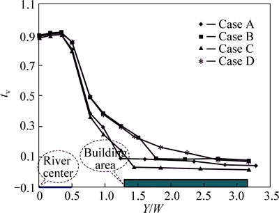 To analyze the effect of water, we selected 11 sections starting from the river center to the edge of the building area (Fig. 10). As observed from the wind tunnel experiment results, the variation of indices became dramatically near to the water body. Therefore, the distance between two sampling sections was set gradually longer when they were away from the water body. The wind direction and details of the location of the base line are also marked in Fig. 11.
