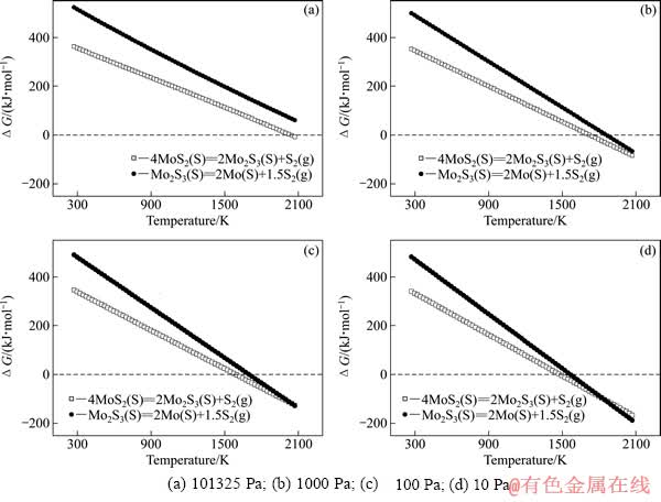 在Mo-S系中,有两种稳定化合物,MoS2和Mo2S3[12]。按照化合物的逐级分解原则,MoS2先分解为Mo2S3,然后继续分解为金属Mo[13]。不同压力下MoS2和Mo2S3分解的Gibbs自由能[14]如下所示: