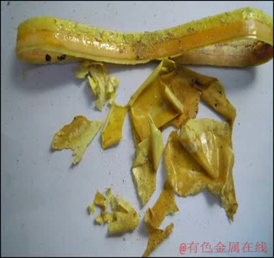 收集到的硫磺如图8所示。由图8可看出,分解产生的硫磺呈片状或条状,这是由于炉腔上部管壁的温度较低,分解产生的硫磺附着于炉腔管壁上,随附着位置的不同而呈现不同的形态,这表明硫磺可以采用冷凝的方式回收。硫磺成分如表4所列,其中S含量可达到98.6%,杂质含量较少,这主要是由于分解过程中不同挥发组分、产物的挥发温度和冷凝温度与硫磺的产生温度和冷凝温度不同,钼精矿中的As、Pb、Bi、Cu、Sn等并没有全部进入S相,因此,通过控制工艺条件可以实现有价元素的回收。此种硫磺产品已接近工业硫磺合格品要求,具有较高的利用价值。