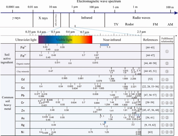 众多研究表明,绝大部分重金属只有在其污染浓度超过4.0 mg/g左右时其光谱特征才能被有效识别,当低于此浓度时其响应特征易被其他土壤组分的光谱掩盖[62]。土壤活性成分是指在土壤中其成分发生改变会对土壤光谱反射率产生明显影响,具有明显光谱响应特征的土壤组分,如土壤水分、有机质、铁锰氧化物、黏土矿物等。众多研究表明,土壤中Cu、Cr、Cd、Pb、Zn、As、Ni、Hg元素均与铁氧化物和有机质[20, 47, 53-55, 60, 67-70]存在良好的相关关系。此外,Cr、Ni、Cu、Zn和Pb与黏土矿物也存在相关性[47, 53, 55, 60]。重金属及其相关土壤活性物质总结如图2所示,其中①代表铁氧化物、②代表有机质、③代表黏土矿物。