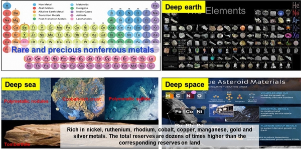 相比煤、石油、铁矿等常规资源,稀有与贵重有色金属矿产资源种类繁多、分布稀散、难以提取,且大都属于战略资源。地球深部和深海区域蕴含了丰富的贵重有色金属,同样在深空也富含有色金属资源,甚至比地球上蕴藏的含量更为丰富、种类更为多样,如图1所示。由于有色金属矿物资源本身品位低,大多数随地层深度越大矿物品位越低,且大都属于热液型矿床,从而导致矿岩硬度强、应力大、温度高,开采和提取困难,成本昂贵。虽然中国有色金属矿产资源丰富、种类繁多,但作为全球有色金属最大生产国和消费国,保持有色金属开采可持续发展仍具有重大意义[7]。