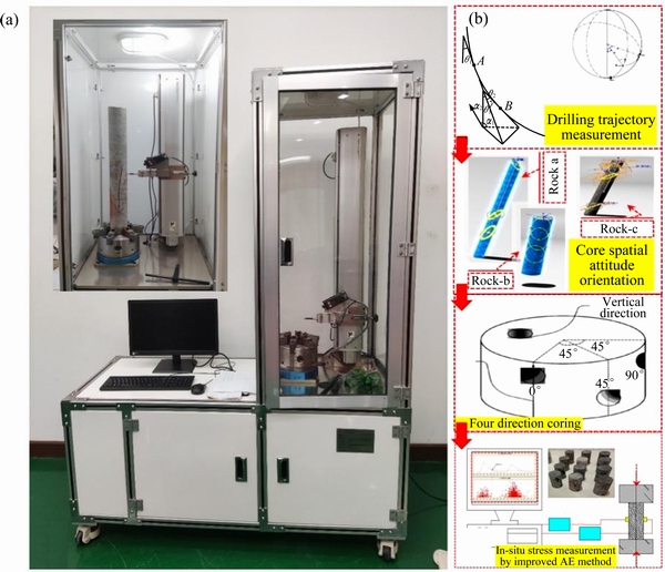 Fig. 5 Experimental equipment for core surface relocation survey(a) and operation flow of AE in-situ stress measurement method based on core surface relocation technology(b)[33-35]