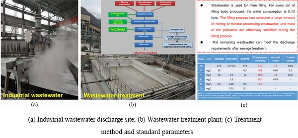 3) 废水达标排放。深地开采中,采矿、选矿等环节会产生大量废水。一方面,在充填过程中尽量使用采矿或选矿废水,使得大部分污染物在充填过程中被有效固化;另一方面,剩余废水经过污水处理后再达标排放,从而实现含渣废水的零排放[46],如图7所示。深海采矿作业将给海底、上层水体和周边环境造成影响[47]。例如,为了开采结核而进行的海底刮擦会破坏章鱼、海绵动物及其他物种的深海栖息地。大量的动物群落集中在深海热泉附近,这些海洋动物组成了地球上最富活力的生态系统之一,而在热泉喷口采矿可能会扰动沉积物,造成一些动物窒息。其他一些生活于深海、适应了少光高压环境的物种也有可能受到开采带来的噪音和污染影响。因此,我们必须就深海采矿对这些生物或生态系统的影响进行深入研究。