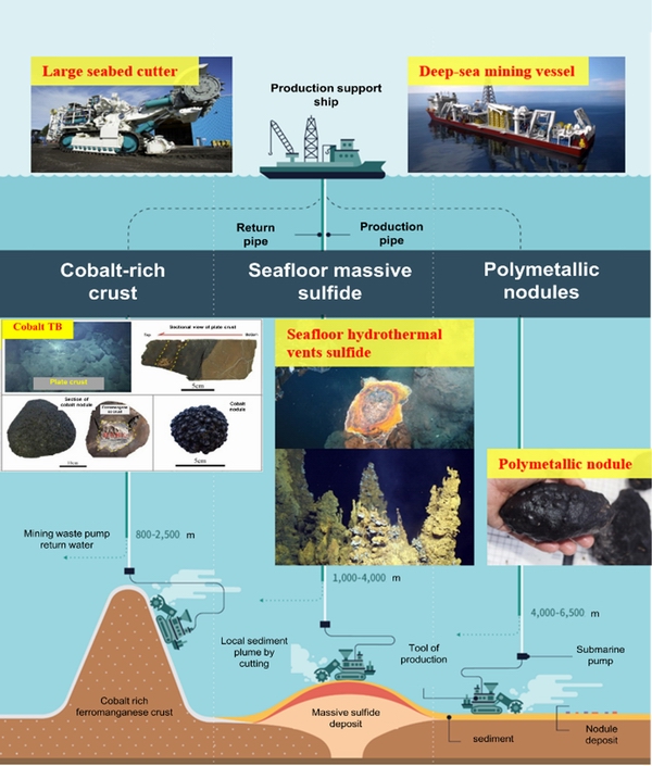 对海底开采进行管理的组织是国际海底管理局(ISA),这是一个依照《联合国海洋法公约》(United Nations Convention on the Law of the Sea)成立的管理定制深海资源行为准则的独立机构,总部位于牙买加金斯顿,现在共有包括欧盟在内的168个国家和地区组织成员。目前该国际组织拟定的开采目标包括镍、铜、钴、锰、锌、银和金等矿产资源。前期勘探工作主要集中于三类海洋矿产资源,包括深海多金属结核、多金属硫化物(即深海热泉附近形成的“深海块状硫化物”)和覆盖在海底山上的富钴铁锰结壳。勘探区域主要集中在太平洋、大西洋中部和印度洋海域[21]。