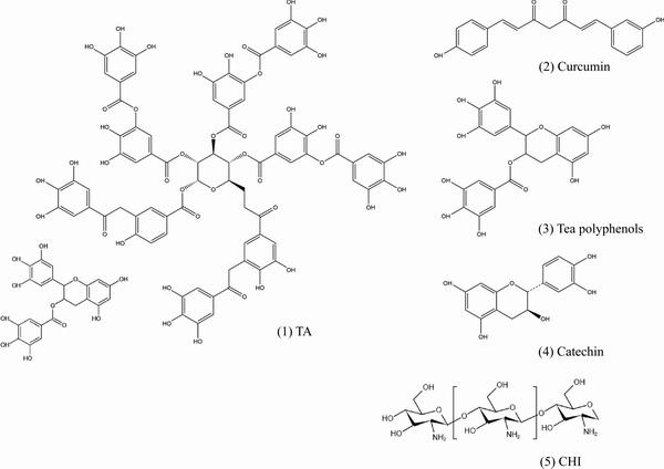 自古以来,人们就善于使用大自然中的天然物质来抵抗疾病。随着科学技术的发展,植物中的有效物质逐渐被分离、纯化,特别是一些多酚类提取液和类黄酮类有机物表现出较好的抗炎症、抗过敏、抗血栓、抗癌和促进血脉舒张等作用,图2所示为常用天然活性物质分子式。