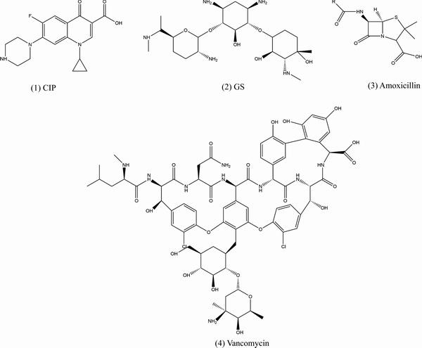临床环境下的抗感染主要以抗生素等药物为主,即在涂层中负载药物仍是赋予镁及合金抗菌能力最有效的方式,常用的药物包括环丙沙星(盐酸)(CIP)[115-116]、庆大霉素(硫酸)(GS)[117-119]、万古霉素[120-121]、阿莫西林[122]等(见图3)。然而,药物应用到镁及合金表面时面临着两个巨大的挑战:药物递送和药物缓释。