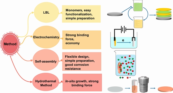 基于上述不同抗菌物质的不同特性,为了更好地解决镁及合金降解速率过快的问题,同时赋予表面抗菌功能,研究者们重点关注以下几种涂层制备方法(见图5)。