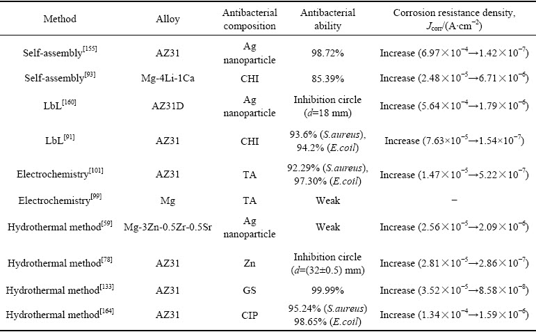 不同制备方法和抑菌因子对不同种类镁合金耐蚀抗菌能力的影响如表5所示,自组装、LbL、电化学、水热法等均可导致镁合金自腐蚀电流密度降低2~3个数量级,即镁合金耐蚀性的提升与制备方法关系不大,而主要取决于合金种类、涂层结构和成分。同一种抑菌因子,通过不同制备方法实现负载时,其抑菌性能不同,这主要是由于抑菌因子在涂层中的分布与释放形式不同。因此,涂层设计过程中,需要研究者们根据需求,选择适宜的抑菌因子和涂层制备方法,平衡涂层可控降解与抗菌性之间的关系。