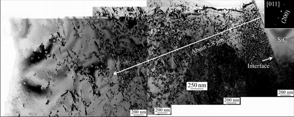 ASHBY等[29]研究发现,复合材料中基体和增强相之间的热错配导致界面附近基体应力松弛,其位错密度可高达未增强铝合金基体的100倍;VOGELSANG等[30]、王博[31]利用高压原位电子显微镜的观察结果进一步验证了这一结论。GUO等[32]研究不同粒度SiC增强铝基复合材料中的界面性能,发现当SiC平均粒径为13 μm时位错密度急剧增大区域可达2.8 μm,且越靠近界面处位错密度越大,对应的TEM像如图3所示。