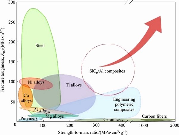 强度是颗粒增强铝基复合材料的主要力学性能指标,工业常用材料的力学性能如图5所示[60]。随着现代工业、航空航天等对轻质高强材料的需求增加,大量材料研究工作者在单一材料研究的基础上把目光投向可得到更高比强度、断裂强度的SiCp/Al复合材料。YANG等[61]在不同尺寸的SiC颗粒增强不同强度铝基体的研究中发现,SiC颗粒引入带来的强化效果不同,最高可达50%以上。当SiC粒度达到纳米级时,对强度的增强效率更强,可达微米颗粒的十倍级别[3];但由于纳米SiC颗粒比表面能大、易团聚,很难实现大量添加。ZHANG等[62]研究微米与纳米双尺度SiC颗粒混合增强Al2014基复合材料,其抗拉强度可达585 MPa,远高于单一尺度颗粒增强效果。