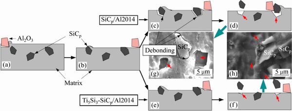 Fig. 6 Schematic diagram of abrasive wear behavior and worn surface for SiCp/Al2014 composites reinforced with uncoated and Ti5Si3-coated SiCp((a)-(f)) and worn surface of 10% uncoated(g) and Ti5Si3-coated SiCp/Al2014 composite(h)[71]