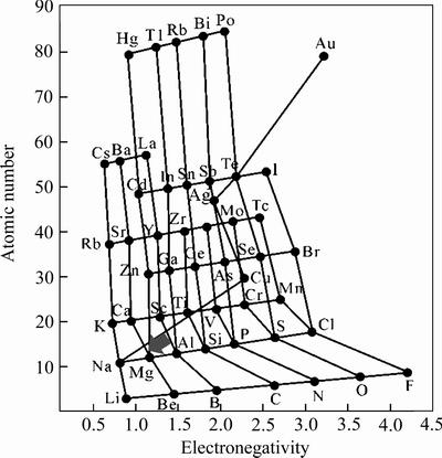 除原子尺寸因素外,还需要考虑电负性,即溶质与溶剂元素的化学亲和力。溶质与溶剂元素的电负性差别对固溶也有很重要的影响。基于Hume-Rothery的固溶体理论,可以认为可形成固溶体的溶质与溶剂元素的电负性相差的绝对值应低于0.4。图3所示为原子序数与电负性的关系[27-28]。由图3可见,可能与Mg形成固溶体的元素位于图中两个虚线之间。