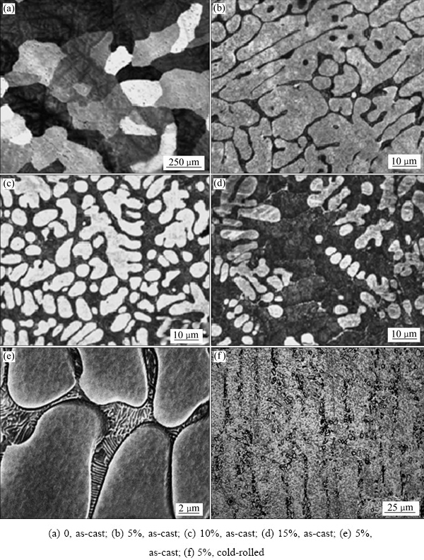 钙:Ca是镁锂合金的常用合金元素之一。Ca在镁锂合金熔体的凝固过程中易偏聚在α-Mg相的结晶前沿,抑制晶粒长大,起到显著细化组织的作用。由Mg-Li-Ca三元相图可知,Ca在Mg-Li-Ca合金中具有一定的固溶度(150 ℃达到最大值),存在第二相Mg2Ca和CaLi。因此,该镁锂合金系中也可产生第二相强化[64],且高熔点第二相颗粒Mg2Ca的形成可提高合金的高温性能[41]。在该合金系中,除了Mg2Ca之外,也容易生成高熔点的CaMgSn。在Mg-Sn合金中逐渐增加Ca含量,合金中易生成稳定性更高的CaMgSn相,既能增加合金的强度,又可提高抗蠕变性能[44, 64]。SONG等[41]系统研究了Ca含量对Mg-12Li-xCa系合金的影响。结果表明,该合金系主要由枝晶状的β-Li和β-Li与化合物Mg2Ca的共晶组织。该共晶组织的含量随着Ca含量的增加而增加。冷轧破坏Mg-12Li-5Ca合金中的共晶组织形貌和分布,使层状共晶组织破碎、细化。他们的研究还表明,添加Ca元素可增加镁锂合金的抗氧化性能。图5所示为不同Ca含量下铸造态和冷轧态Mg-12Li-xCa合金的微观组织。