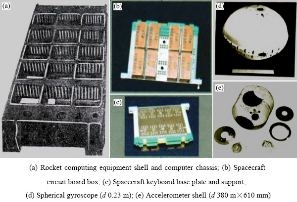 CШA公司采用其研发的镁锂合金制备了火箭和宇宙飞船的部件,使“Apollo”号飞船的质量减重22 kg。此外,该公司还采用其研制的镁锂合金制造计算设备外壳和计算机底盘,并成功用于“Caтурн-V”号火箭,如图9(a)所示。基于Lockheed导弹与航空公司的工作,IBM采用Brooks & Perkins公司提供的镁锂合金材料开展了表面处理和焊接等方面的研究并取得突破,研制出用于“Saturn V”号运载火箭的计算机室(降低质量20 kg),用于美国航空航天局双子座宇宙飞船的线路板盒(见图9(b))及键盘基板与支座(见图9(c))。美国富兰克福兵工厂研制了Mg-14Li-3Ag-5Zn-2Si镁锂合金,随后麻省理工学院采用该合金制备了惯性导航系统中的球形陀螺仪(直径为0.23 m)(见图9(d)。北美航空公司自动控制部门采用镁锂合金制备了加速仪壳体(d 380 m×610 mm)(见图9(e))。
