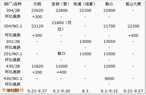 9月份不锈钢市场呈先扬后抑,冲高回落,后持续震荡运行的走势。月初伦镍受 宏观经济消息面影响而震荡反弹。国内方面,8月份PMI指数在连续三个月回落后首次有所回升,而且近几个月该指数持续位于临界点50%以上。PMI指数小 幅回升预示经济增速回落势头已显著放缓,中国经济不会出现深度回调,不过需要关注购进价格指数大幅提高可能对企业成本形成较大压力。同时受伯南克将采取进 一步措施刺激经济言论及日本宣布实施新的经济刺激计划等利好消息的鼓舞,市场风险偏好得到了很大程度的改善,国内外股市止跌反弹,推动原油黄金和金属一 起走高。种种迹象表明,目前市场的多头势力强劲,近期价格或将涨至更高,其下一目标将是22300美元附近,目前的支撑在21000美元附近。在伦镍震荡 反弹的影响下,国内不锈钢市场价格小幅上涨,市场成交稍有起色和镍价上扬对行情得推动作用有所体现,商家心态得到改善,前期的盘整使市场底部相对稳固。冷 热轧价格有所拉大,冷轧资源上涨较快。中上旬市场高位震荡:受消息面影响震荡上升。近期美国重要经济数据都能被市场找出利好的证据,证明美国经济并未达到 人们想象的那种衰退程度。人们也一直期待和猜测美国将如何采取新的措施来遏制二次衰退的开始。包括对企业进一步减税以帮助创造就业,延长对中产阶层的减税 期。美国还将采取重建基础设施并加大对清洁能源和研发的投资等一系列措施。目前期镍的多方和空方的拉锯战开始出现倾斜于多方的变化。因为市场似乎相信美国 以及欧洲经济体将成功避免双底衰退。眼下最重要的是,美国将公布一揽子经济刺激措施,提振正在复苏之路艰难攀爬的美国经济。劳工节过后美股或将继续攀升。 周边大势的一再提振,期镍高位震荡走高便是必然。国内不锈钢市场价格明显上涨,涨幅在400-500元之间。限电减产降低了国内镍替代品镍铁的产量,使得 不锈钢生产商不的不在生产中使用更多价格更昂贵的电解镍;而铬铁价格也较8月份出现了大幅上涨,不锈钢的生产成本已大幅上涨,这将促使钢厂保持较高的出厂 价格,从而带动现货价格走强。中旬市场小幅下滑:受消息面影响上涨。中国8月份经济数字较好以及房地产调控和淘汰落后产能的政策相互交织,美国好坏不一的 经济数据未能给市场带来明确的方向,欧元兑美元触及一个月高点, 基本金属受到欧元走强支撑。世界金属统计局(WBMS)的数据显示镍市的自身基本面较好,今年1-7月全球镍市供应短缺51,000吨,而去年同期则为供 应短缺7,500吨。 前7个月镍矿产量为790,000吨,较上年同期下滑1.1%。 WBMS表示,全球镍表观需求较上年同期增长105,000吨. 国内不锈钢市场价格盘整运行,成交情况较前期有所滑落。主导钢厂平盘,市场对9月的预期略减,商家进货的热情不高。主导城市无锡库 存量维持在20万余吨,市场供求状况维持平衡状态。近期市场利好消息淡化,市场心理波动决定了价格的走势,伦镍金属冲高动力减弱,刺激价格上涨的因素不是 很强烈,不锈钢现货价格将小幅滑落。中下旬市场平稳运行:伦镍收盘在23085美元,下跌179美元,持仓95007手。库存119244吨,减少168 吨。LME基本金属周一收盘大多微幅下跌,因一些投资者选择在美国联邦公开市场委员会会议前锁定获利,预计该会议或将提供可能实施的进一步量化宽松举措的 线索。欧洲午后交易时段,欧元兑美元下跌,拖低基金属及贵金属价 格。全美住宅建筑商协会(NAHB)周一公布的数据显示,9月美国楼市依旧疲弱,数据弱于预期,令市场又增对美国经济复苏的担忧。LME库存继续下降为价 格提供支撑,国内不锈钢市场价格平稳运行,临近中秋节,节日气氛浓厚,成交走低,虽然钢厂在拉涨出厂价格以反映成本的上升结果,但目前行情仍以稳为主,预 计节后市场才会反映出来。本周太钢出厂协议价304涨300元,冷卷23920元,热卷23120元;430涨200,冷卷切边11820元。随着国内限 电措施的推行,部分镍铁企业的产量有所减少,不锈钢的生产成本有所上涨,成本的推动也是价格上涨的动力之一。截止到9月27日,304/2B:无锡太钢 304/2B/2.0/C主流价为21900元,较上月同期上涨200元;板21400元,比上月同期上涨800元;张浦产304/2B/2.0/C报至 23200元,较上月同期上涨1000元。304/No.1:无锡正常公差的宝钢、太钢304/No.1卷在22000元,较上月同期上涨600元,同规 格板在20500元,较上月上涨800元。