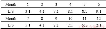 In order to simulate the long-term leaching effects of the residue in the acid rain environment, a long-term leaching experiment was designed with reference to ANS (1986) standard [20]. The residue used for testing was 200 g every time. The leaching agent (deionized water, adjusted to pH=3.20±0.05 with concentrated sulfuric and nitric acid solution of mass ratio of 2:1 was used to simulate the acid rain. Elution flow rate was calculated according to the hydrologic conditions of the origin of the residue, which was averaged from the rainfall of the past 10 years. Leaching period lasted for 12 d, and the monthly average was simulated by the daily flow in details. The ratios of the daily leachate and residue calculated by the rainfall are shown in Table 2.