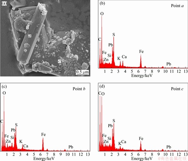 EDX analyses for the residue were conducted at 3 different points in Fig. 3(a), namely a, b and c. Figures 3(c-d) show the EDX results of the compositions of points a, b and c, respectively. A considerable amount of C was detected in all sites of the residue according to the EDX result, indicating that C and other metals formed an important fraction in the residue. Carphosiderite and carbon are the main phases in point a, mixed with a small amount of zinc sulfate, silicates and other minerals. And C in this point accounts for 35% of the total amount, Fe for 14% and Zn for 1.7%. Carbon, carphosiderite and zinc sulfate are the main phases in point b. C accounts for 36% of the total amount, Fe for 16% and Zn for 2.7%. Carbon, carphosiderite and anglesite are the main phases in point c. C in this point accounts for 47% of the total amount, Pb for 3.4%, and anglesite is the main phase that Pb exists. The results of SEM/EDX demonstrate that heavy metals do not exist alone. Instead, they mix complicatedly with each other.