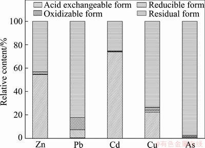Among the metals studied, the highest content of acid exchangeable forms is Cd and the lowest is Pb (Fig. 4), whereas the corresponding contents of Cd, Cu, Pb , Zn and As are 74%, 22%, 0.3%, 54% and 0.63%, respectively. It is revealed that the exchangeable and carbonate phase of Cd, Zn and Cu in the residue is as high as 1107.75, 29127.75 and 536.64 mg/kg, respectively. The results of exchangeable form of Cd, Zn and Cu in the residue show that all of them have high environmental activity. And some researchers have reported the enhancement of the leaching rate during the simultaneous leaching of metal oxides and metal sulfides [28], suggesting that a large amount of Cd, Zn and Cu would be released by the heavy rain.