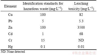 Environmental activity of heavy metals is the generalization of their toxicity, bioavailability and geochemical behavior. A considerable amount of studies on environment activity of heavy metals had been done by various researchers from different countries. TSIRIDIS et al [10] used the toxicity characteristic leaching procedure (TCLP) to study the leaching toxicity of coal fly ash. KAZI et al [11] studied the mobility of toxic metals in untreated industrial wastewater sludge using a BCR sequential extraction procedure and a leaching test. WONG et al [12] studied the toxicity of sewage sludge by the content of elements, speciation of heavy metals and seed germination test. While, WANG et al [13] studied the release of heavy metals in Pb/Zn tailings under acid leaching conditions. However, no systematic research had been done on environmental activity of heavy metals. As a result, the total content of heavy metals, mineralogical analysis, chemical speciation, leaching toxicity test and long term leaching test were applied to systematically evaluate environmental activities of heavy metals in zinc leaching residue, combining with environmental conditions.