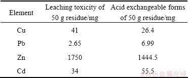 The content of acid exchangeable forms of Cu, Pb, Zn and Cd in 50 g residue was 26.4, 6.99, 1444.5 and 55.5 mg, respectively. And the leaching toxicity of Cu, Pb, Zn and Cd in 50 g residue was 41, 2.65, 1750 and 34 mg, respectively (Table 9). The amount of heavy metals existing as acid exchangeable forms was all close to the leaching toxicity values of the residue, suggesting that all of the acid exchangeable forms of heavy metals in this residue could be leached out under certain conditions.