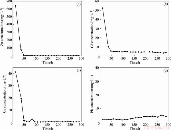 The leaching behavior of Pb was different from those of Zn, Cd and Cu in the residue (Fig. 5(d)). The concentration of Pb was low at the beginning, but increased with the extending of time. Maybe it was because Pb existed in different forms (mainly existed in residual forms) from Zn and Cd, which mainly existed in acid exchangeable forms. BCR analysis showed that 0.3% Pb existed in acid exchangeable forms, so it was hard to release at the beginning. Nonetheless, a considerable amount of Pb existed in reducible and oxidizable forms, accounting for 7% and 10.5% of the total content. The increasing concentration of Pb with the leaching time indicated that these two forms of Pb converted into acid exchangeable form [31,32,34].