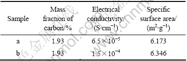 为了考察无机三价铁源对所制得的LiFePO4/C复合材料的电导率和比表面积的影响,本实验中测试样品a和b的电导率和比表面积,其结果如表1所列。由表1可知,样品a和b的电导率分别为6.5×10?5和1.5×10?4 S/cm,比纯LiFePO4(电导率在10?9~10?10 S/cm之间[17])提高4~5个数量级,这说明产物中的碳和Fe2P的存在能极大地提高材料的电导率。此外,样品b的比表面积和电导率均略大于样品a的,这似乎与前面所知样品b的晶粒尺寸大于样品a的结果不相符合,但是图2可知,样品b中包含大量的蜂窝状团聚体,其特殊的晶体形貌可能是产生这一结果的原因。