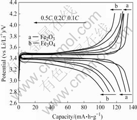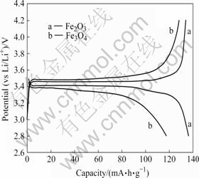 2) 采用Fe2O3为无机铁源制得的材料具有较高的放电比容量和放电比能量,以0.1C充放电时,其第三次放电比容量为136 mA·h/g,放电比能量达462 W·h/kg;而由Fe3O4制得的材料放电比容量和放电比能量均较低,以0.1C充放电时,其第三次放电比容量仅为118 mA·h/g,放电比能量仅达394 W·h/kg。
