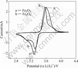 为了从机理上说明造成样品a和b电化学性能差别的原因,本实验中测试了这两个样品的循环伏安特性,结果如图4所示。从图4可以看出,样品a和b的CV图上均出现了一对氧化还原峰,其中样品b的氧化还原峰的电位差略小于样品a的。这与其较高的电导率和较大的比表面积有关。另外,样品a的峰形尖锐,氧化还原峰的对称性好,其阴、阳极峰电流值(分别为2.41和2.10 mA)非常相近,表明绝大部分锂离子能可逆地脱/嵌于活性物质当中,显示出优良的充放电可逆性能。而样品b的氧化还原峰的对称性较差,其阴极峰电流值(1.54 mA)比其相应的阳极峰电流结果(2.41 mA)要小得多,表明有相当大的一部分锂离子在脱出之后不能够可逆地插入其活性物质当中,即该材料在充放电过程中发生了较大的容量损失,材料的可逆充放电性能较差。此外,样品b的峰形不尖锐,其氧化还原峰上均存在明显的肩峰,表明锂离子在其中脱/嵌困难。以上结果说明,可逆充放电性能较差与锂离子脱出/嵌入困难是造成样品b电化学性能较差的原因,从而证实了前面的推测结果。
