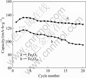 3) 由Fe2O3制得的材料倍率性能和循环可逆性能较好,当放电倍率分别为0.1、0.2和0.5 C时,其放电比容量分别为136、131和125 mA·h/g,以0.1C充放电循环20次后其容量基本无衰减;而以Fe3O4制得的材料倍率性能和循环可逆性能都较差,其0.1、0.2和0.5C下的放电比容量仅分别为118、111和104 mA·h/g,以0.1 C充放电循环20周后其容量下降了近17%。