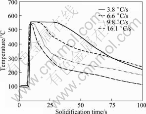 The rapid solidification experimental procedures were as followings. First, the Al-Si alloy ingot was placed in an induction furnace to melt: The temperature of the furnace was set at 715 ℃, then this temperature was kept for 2 min to stabilize and homogenize the melt. Next, the melt was cooled to the pouring temperature and then rapidly solidified to room temperature. A controlled flow of compressed gas and/or atomized sprayed water was used to obtain high cooling rate. The curves of solidification temperature and cooling time shown in Fig. 1 were automatically calculated and plotted. As shown in Fig. 1, the cooling rates of 4 different samples with thickness of 20, 40, 60 and 80 mm were calculated as 3.8, 6.6, 9.8 and 16.1 ℃/s, respectively.