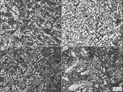 Fig. 2 OM images of Al-10%Si alloys at different cooling rates: (a) 16.1 ?C/s; (b) 9.8 ℃/s; (c) 6.6 ℃/s; (d) 3.8 ℃/s