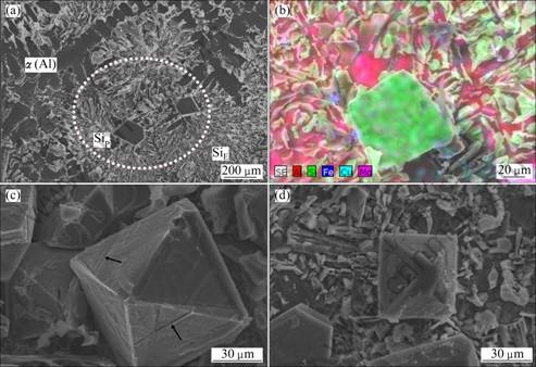 Fig. 3 SEM images of hypoeutectic Al-10%Si alloys showing 2D microstructure (a), EDS mapping and SiP showing 3D features (b), perfect octahedral primary silicon (c) and imperfect octahedral primary silicon (d)