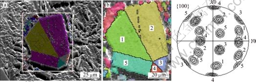 Fig. 4 SEM image of Al-10%Si alloy showing primary silicon particle (a), orientation imaging micrograph (b) and {100} pole figure (c)