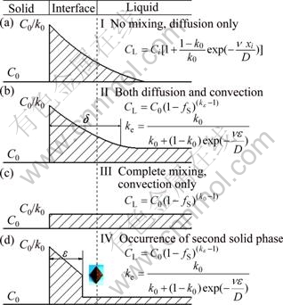 The schematic diagrams in Fig. 5 illustrate four different mechanisms regarding solute redistribution at the solid/liquid interface. TILLER et al [13] assumed that the diffusion in the solid was negligible, and thus the diffusion in the liquid was only considered in Case I (Fig. 5(a)). The solute distribution in the liquid is governed by Fick’s second equation [14] as: